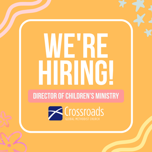 We’re hiring! Crossroads Global Methodist Church is seeking a full-time Children’s Ministry Director to lead a vibrant, Christ-centered ministry for children ages 3 through 5th grade. This position is perfect for someone with a heart for God, a passion for helping kids grow in faith, and the creativity to make church a place children love to be. The director will oversee Sunday morning and Thursday night programs, Vacation Bible School, and special events—building and equipping volunteer teams to make it all happen. If you’re a passionate, organized leader who loves sharing Jesus with kids and families, we’d love to hear from you. To apply, send a cover letter and your resume to Donna Cimino at [email protected].